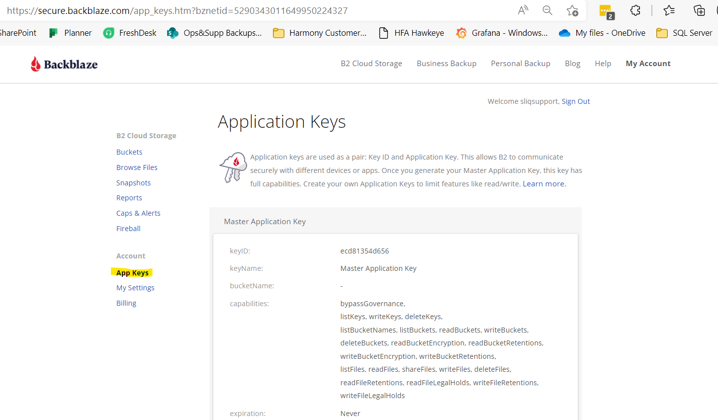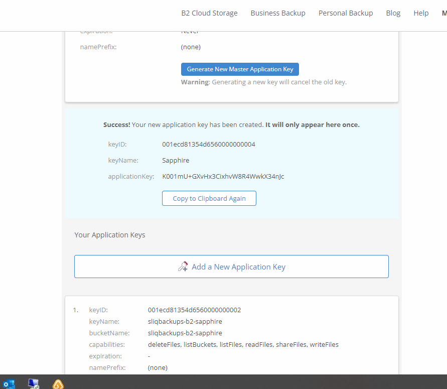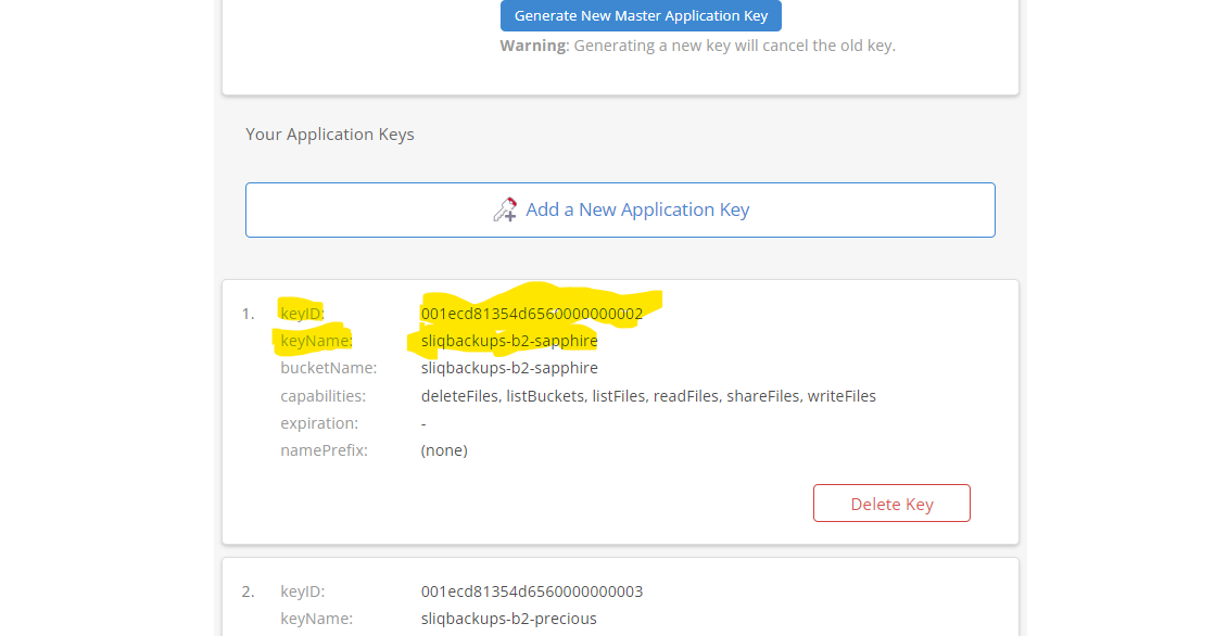 5- Scroll down and select one of the “keyID” windows for “sliqbackups-b2-sapphire”.
