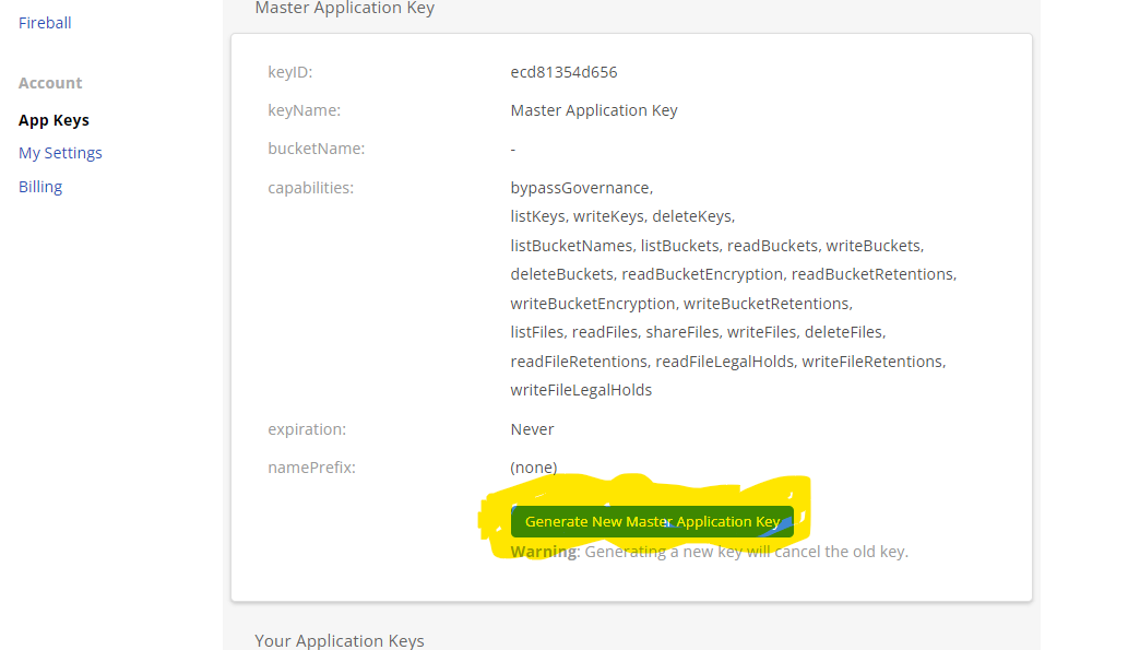 7- Next click on the “Generate New Master Application Key” blue button.